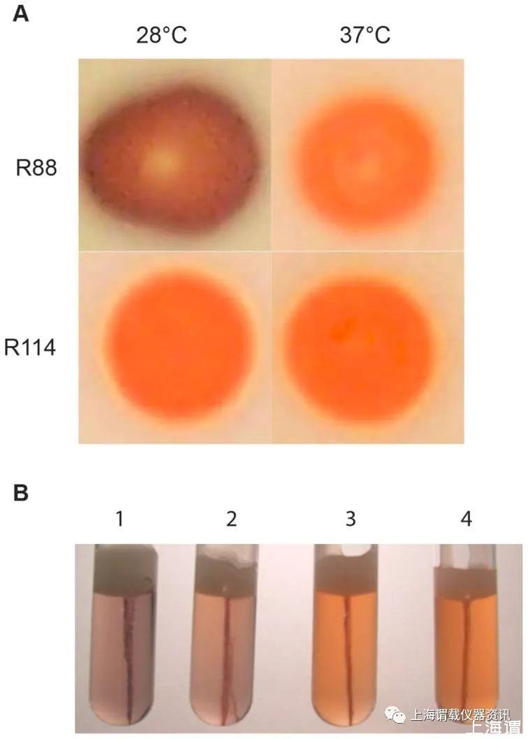 图4、群体感应调节糖的发酵。(A)在含有刚果红和0.2%麦芽糖的LB平板上生长96小时后的菌落表型,并在指示温度下孵育。鼠疫杆菌将麦芽糖发酵成酸,将刚果红转化为黑,而yspIR ypeIR突变体则不会。这种发酵不会发生在温度超过30度或其他糖的条件下。(B)鼠疫杆菌在固体培养基上厌氧培养96 h,培养温度为28度。刚果红是一种指示剂染料,在生产发酵最终产品时变暗。R114和R115中yspIR和ypeIR的缺失导致了麦芽糖在厌氧条件下发酵的滞后。1=Y.假结核杆菌;2=R88;3=R502;4=R115