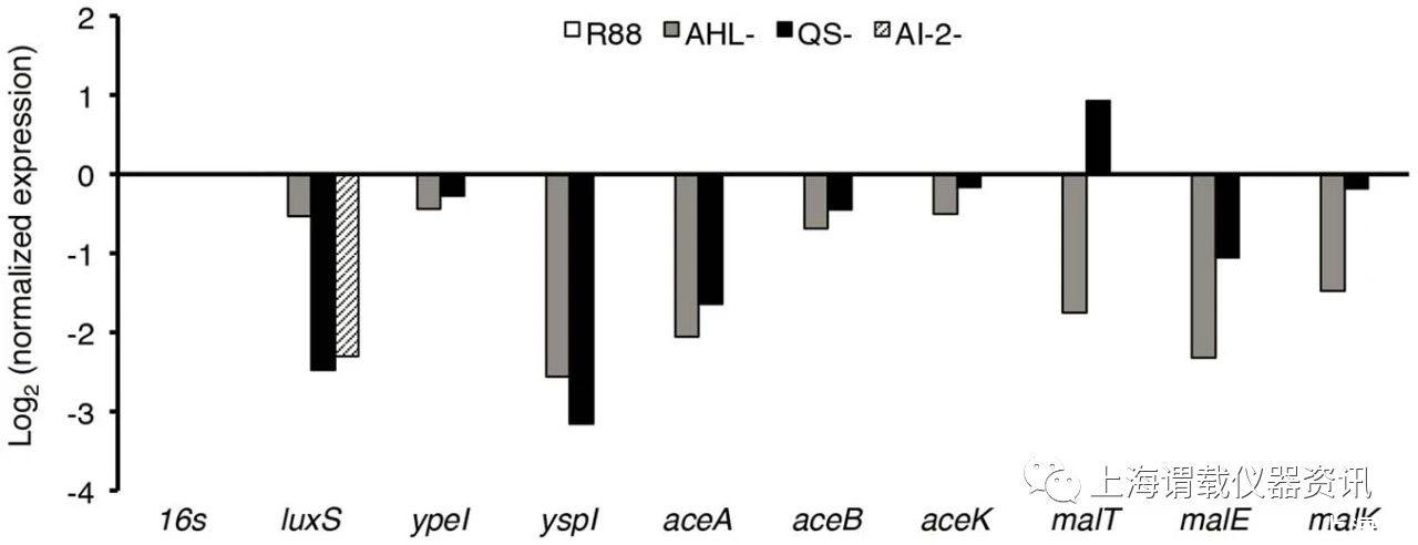 图2、Ahl的QS调节次生代谢。从指定菌株中分离RNA,按材料和方法采用qRT-PCR检测mRNA水平。数据代表了每个突变体与R88品系之间转录差异的三倍测量平均值,R88品系的转录差异归一化为每个样本的16S rRNA,代表了至少三个独立实验。