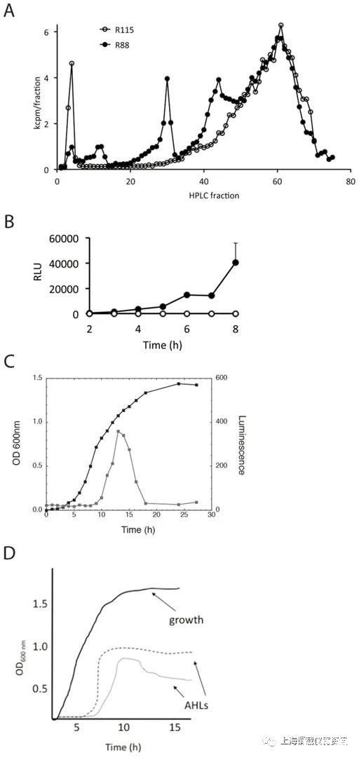 图1、鼠疫杆菌群体感应分子的鉴定。图A表示的是R88 Y.鼠疫菌(实心圆)与R115 QS-Y.鼠疫菌(空心圆)生产的14C标记AHL的HPLC分馏图谱。图B表示的是通过在指定的时间点将无细胞上清液添加到一株会对AI-2反应为生物发光(RLU)的V.harveyii报告株中进行监测,监测R88 Y.鼠疫杆菌(实心圆)和R115菌(空圆)生长过程中产出AI-2和AHL的情况。图C和图D分布表示的是AI-2(C)和AHL(D)的生长情况。