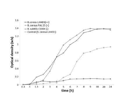 图4、Biosense生长曲线分析仪应用于测试不同菌株芽孢杆菌中添加噬菌体Bc431v3后的代表性微生物生长曲线图,该噬菌体能够完全抑制蜡样芽孢杆菌LJH431的生长(完全裂解++)。而只延迟了B.cereus PAL 25的生长(部分裂解;+)。另一方面,c431v3既不能抑制也不能延迟枯草杆菌C1004的生长。蜡样芽孢杆菌LJH431是指在没有噬菌体Bc431v3的情况下,蜡样芽孢杆菌LJH431的生长情况。