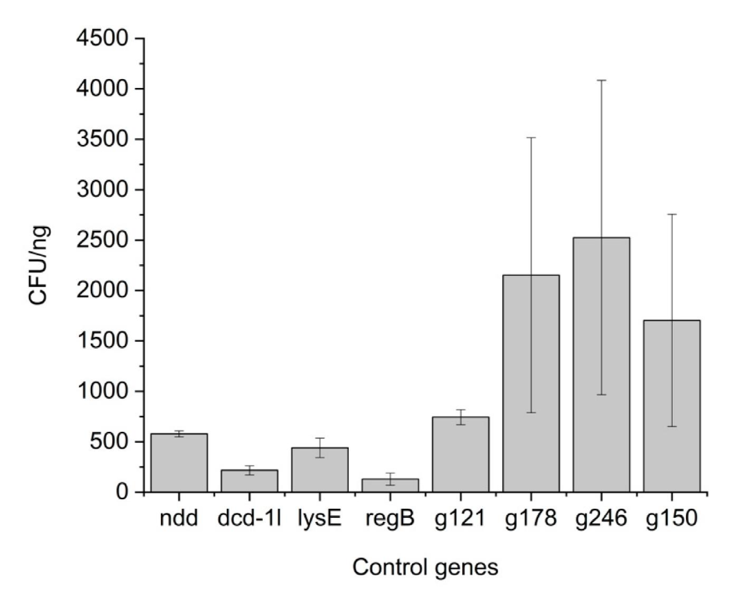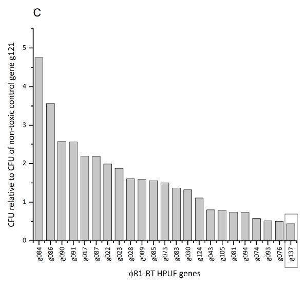 图2、镀层试验筛选94个HPUF基因的相对CFU结果值。镀层效率与对照基因g178(A)、g246和g150(B)或g121(C)进行归一化的相对CFU值。