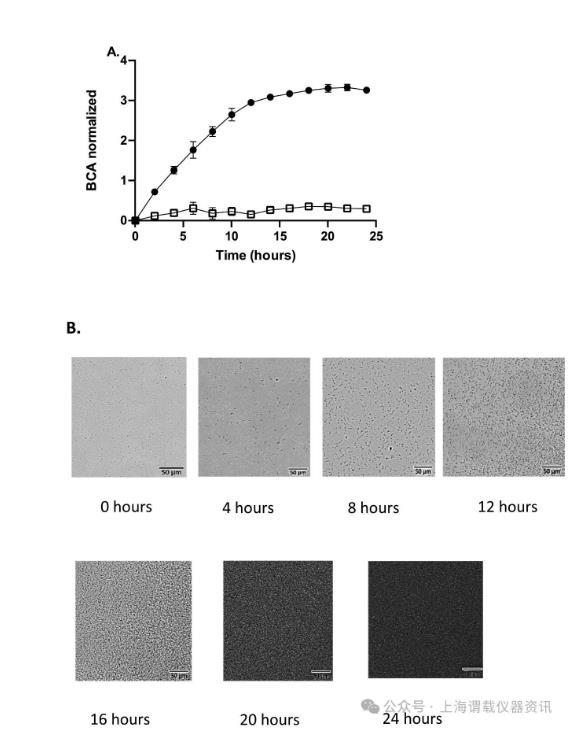 图1、(A)添加TSB后干燥肠炎沙门氏菌的生长,使用oCelloScope测量并在24小时内量化(●)。使用背景校正吸收(BCA)算法分析生长。归一化值是根据初始时间点(0 h)的BCA值计算的。不含肠炎沙门氏菌的TSB用作阴性对照(□)(B)oCelloScope图像显示TSB中肠炎沙门氏菌的细菌数量随时间增加。明场图像表明细菌的数量逐渐增加,直到大约16小时,之后细菌密度太高,BCA算法无法计算。