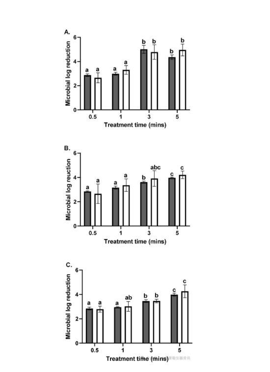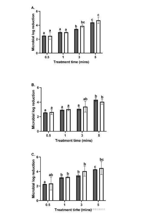 图3、在NaOCl处理30秒、1分钟、3分钟和5分钟后,使用BCA算法(灰色条)与传统MLR量化测定(平板计数,白色条)比较微生物对数减少(MLR)。在用100 ppm游离氯处理粉状的肠炎沙门氏菌(A)、大肠杆菌O157:H7(B)和单核细胞增生李斯特菌(C)细胞不同时间后,对MLR进行量化。相对于未处理的粉状细菌的阴性对照计算对数减少(使用零时间的数据点)。使用双向方差分析进行统计分析。对于每张图,不同的字母在统计上是不同的。