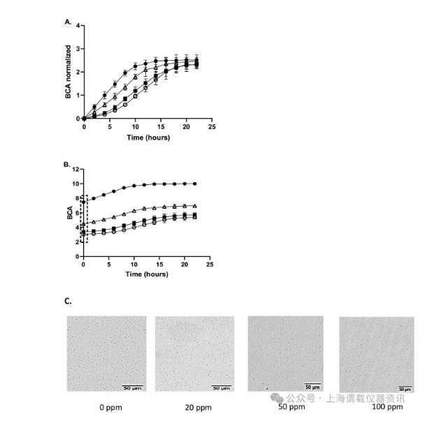 图2、使用oCelloScope监测NaOCl处理后存活的肠炎沙门氏菌细胞的生长。用不同浓度的NaOCl处理微量滴定板中的细菌5分钟,然后加入TSB+0.1%硫代硫酸钠,并使用oCelloScope在室温下监测生长24小时。使用(A)标准化BCA算法和(B)BCA(无标准化)算法绘制微生物的生长数据。用不含氯(●)、20 ppm游离氯(△)、50 ppm游离氯(■)或100 ppm游离氯(○)的溶液处理肠炎细胞。BCA图(虚线框,B)零时间的数据点用于计算BCA减少。(C)oCelloScope图像在用0、20、50或100 ppm游离氯处理后在零时间获得的细菌的数量。