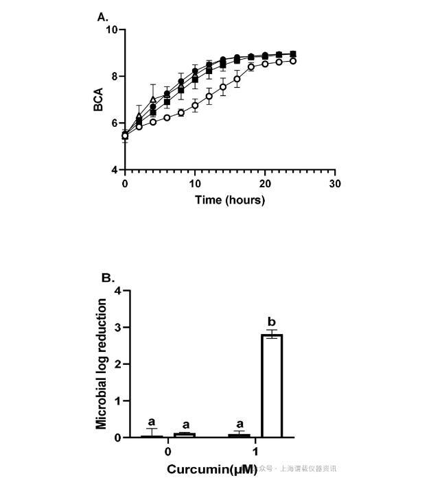 图5、在存在或不存在姜黄素的情况下照射后大肠杆菌O157:H7的微生物对数减少(MLR)。(A)使用oCelloScope测量处理后存活的大肠杆菌O157:H7的生长。大肠杆菌O157:H7未经处理(无辐照或姜黄素,●)、无姜黄素辐照(■)、1μM姜黄素无辐照(△)和在1μM姜黄素存在下辐照(○)。(B)使用或不使用姜黄素(1μM)照射后,使用BCA算法(灰色条)与传统MLR量化测定(白色条)比较微生物对数减少(MLR)。相对于未处理的阴性对照计算对数减少。使用双向方差分析进行统计分析