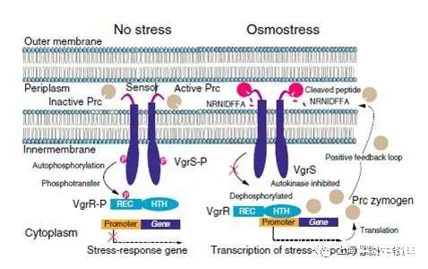 图5、VgrS蛋白水解引起的细菌应激反应模型。当细菌在渗透胁迫下生长时,Prc被激活并分裂n端肽(NRNIDFFA)对VgrS的感测区具有抑制作用,导致后者的自身磷酸化。