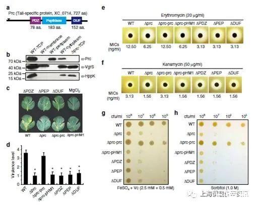 图1、图a表示的是Prc蛋白质二级结构示意图。图b表的是Prc蛋白是位于细菌周质和细胞溶胶中,采用的是采用Western blot技术检测不同细胞组分的Prc蛋白。图c表示的是Prc的失活导致了细菌的毒力的不足。图d表示的是在图c中对应的菌株的毒性评价图,采用了半定量标准测定了菌株的毒力水平。图e、f表示的是该突变体对多种抗生素(红霉素e和卡那霉素)敏感性。图g表示的是Pcr的失活导致了对铁胁迫的过敏,菌株的培养是在含有2.5mM FeSO4+0.5mM维生素C的NYG琼脂上,于28℃条件下培养72 h。图h表示的是Prc的失活导致了对渗透应力的过敏。