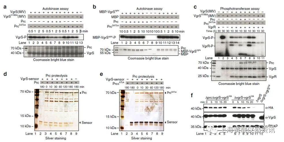 图3、Prc通过切割VgrS的敏感区域来抑制其自身激酶活性。图a-图c表示的是Prc以蛋白酶活性依赖的方式抑制全长VgrS的自磷酸化过程。图d-图e表示的是Prc在体外降解了VgrS感知寄主体。图f表示的是Western blotting显示Prc在体内降解n-末端HA-tags。