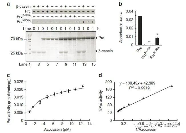 图2、Prc是一种丝氨酸内肽酶。Prc可降解β-酪蛋白,其内肽酶活性依赖于Ser475和Lys500。图b表示的是通过降解底物的偶氮杂蛋白酶定量研究Prc内肽酶活性。图c和图d表示的是偶氮酪蛋白水解酶活性的迈克尔-门登动力学拟合曲线。