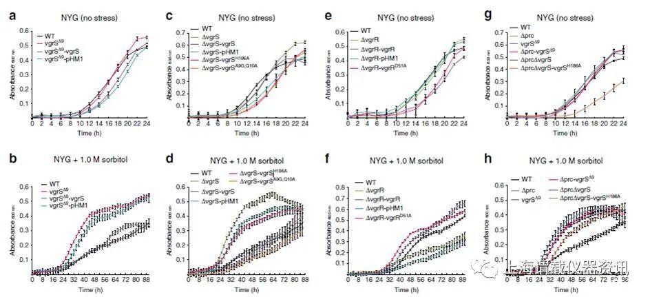 图4、vgrS n端缺失抑制了突变体在渗透胁迫下的生长缺陷。图a、c、e和g表示的是细菌在NYG培养基中的生长曲线图。图b、d、f和图h表示的是细菌在NYG培养基加上1.0M山梨醇的生长曲线图。用丹麦Biosense微生物生长动态监测系统测定其其相关的生长曲线分析图。每个数据点是六个样本的平均值。