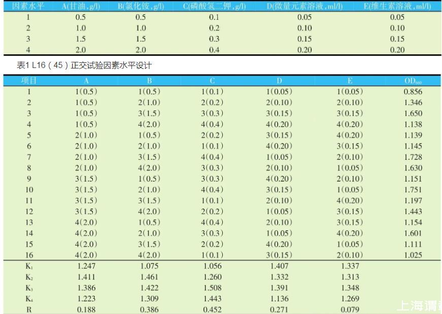 以甘油为碳源,氯化铵为氮源,磷酸氢二钾为磷源,添加微量元素溶液、维生素溶液,设计正交试验L16(45),试验设计见表1,其培养基优化试验结果见表2。由表2可知,对沼泽红假单胞菌R1的生长的影响因素为C>B>D>A>E,因素C磷源磷酸氢二钾为主要影响因素,其它依次为因素B氮源氯化铵、因素D复合微量元素、因素A碳源甘油、因素E复合维生素。其适宜的培养基配方为A2B2C3D1E3,即甘油1.0 g、氯化铵1.0 g、磷酸氢二钾0.3 g、微量元素溶液0.05 ml、维生素溶液0.15 ml、蒸馏水1 000 ml。
