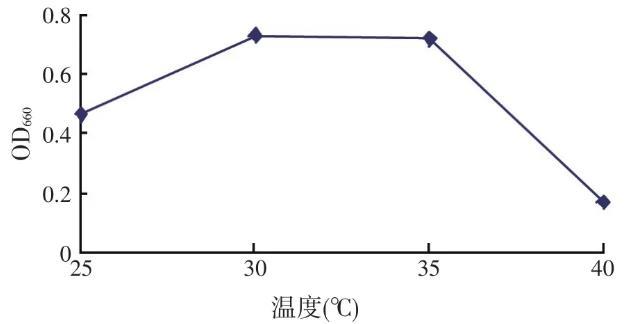 将优化后的培养基初始pH值调整为7.0,灭菌冷却后,接入6%的沼泽红假单胞菌R1液体菌种,分别置于培养温度25、30、35、40℃,40 W白炽灯距离20 cm处静置培养72 h,结果见图5。由图5可知,沼泽红假单胞菌R1在设置的温度下均能生长,较适宜的培养温度为30~35℃,30℃时达到最大值,40℃时菌数OD660值下降较多。
