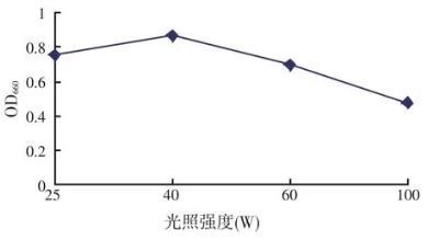 将优化后的培养基初始调整为pH值7.0,灭菌冷却后,接入6%的沼泽红假单胞菌R1液体菌种,30℃,分别置于25、40、60、100 W白炽灯下距离20 cm处照射静置培养72 h,结果见图6。由图6可知,较适宜的为40 W白炽灯下照射,随着白炽灯功率W的增大,菌数OD660值明显下降,分析原因可能为沼泽红假单胞菌R1不需要较强的光照强度。