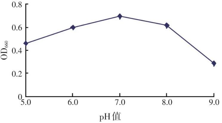 分别调整优化后的培养基初始pH值至5.0、6.0、7.0、8.0、9.0,灭菌冷却后,接入6%的沼泽红假单胞菌R1液体菌种,于30℃、40 W白炽灯距离20 cm处照射静置培养72 h,结果见图4。由图4可知,沼泽红假单胞菌R1较适宜的pH值范围为6.0~8.0,pH值7.0时达到最大值,偏酸、偏碱均不利于其生长。