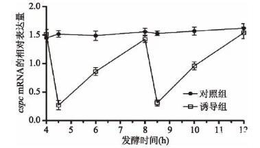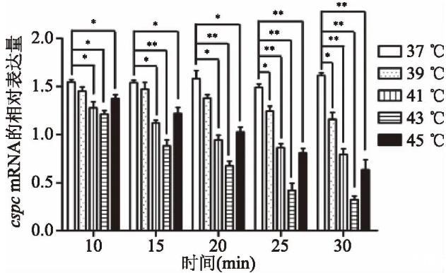 图4温度诱导条件下菌体cspc mRNA基因的相对表达量