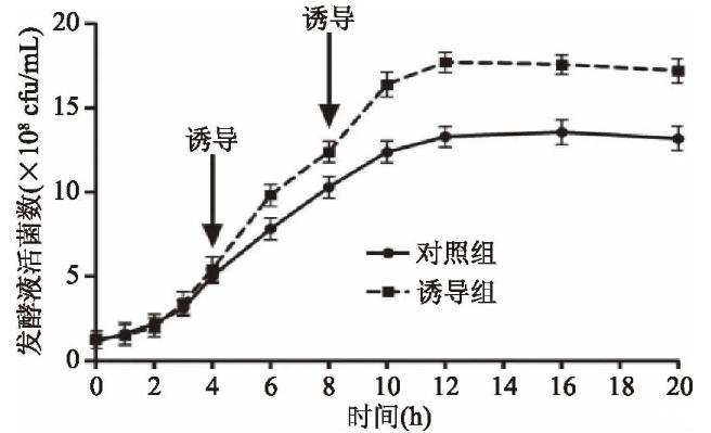 1.2.3生长曲线测定四级发酵液按不同的时间点(0、1、2、3、4、6、8、10、12、16、20 h)取样,测定发酵液活菌数,制作生长曲线。