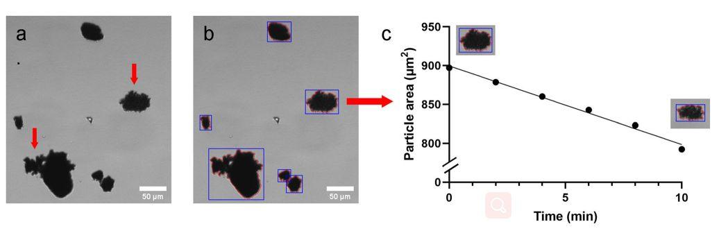 图2、a)显示消炎痛颗粒的视频显微溶出测试的原始输出图像。b)图像分析算法识别的消炎痛颗粒,如蓝色边界框所示,以及由红色轮廓可视化的暴露表面。c)来自单个颗粒的消炎痛溶出数据的线性回归,显示溶出速率为10.11μm2 min-1。R2=0.988