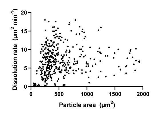 图1、FaSSIF中消炎痛溶出实验的24个孔中所有粒子的溶出率,作为其各自粒子面积的函数。