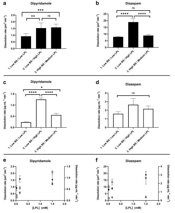 图5、不同浓度胆汁盐和溶血磷脂对视频显微试验。a)双嘧达莫和b)地西泮以及常规小规模溶出试验中c)双嘧达莫和d)地西泮溶出度的影响。溶血磷脂(LPL)浓度对e)双嘧达莫和f地西泮溶出率的影响。左侧y轴(●)为视频显微溶出测试数据,右侧y轴(○)为常规小规模溶出测试数据。进行了单向方差分析统计检验。