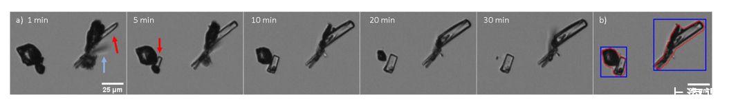 图3、在pH 6.5的FaSSIF中卡马西平颗粒的30分钟延时。b为识别和分析粒子而开发的算法无法将不透明粒子和透明粒子彼此分开。红色箭头表示存在柱状卡马西平沉淀;蓝色箭头表示存在针状卡马西平沉淀。