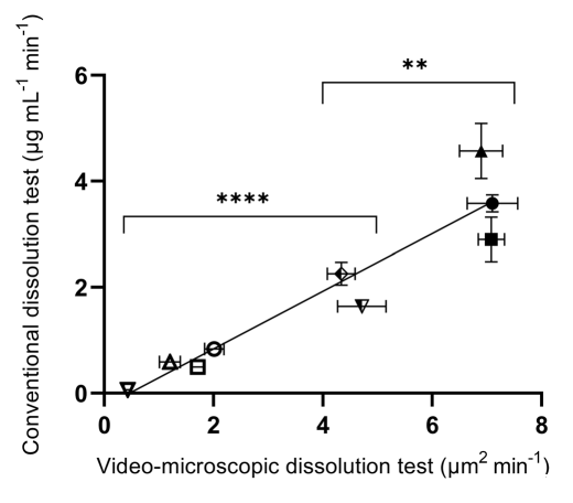 图4、视频-显微溶出度测试数据与常规小规模溶出度测试数据的相关图。R 2=0.87,斯皮尔曼的ρ=0.92,p=0.0013。进行了单向方差分析统计检验。(**):p=0.0012;(****):p<0.0001?!瘢旱匚縻?,■:卡维地洛,▲:消炎痛,?:消炎痛pH 6.0,?:消炎痛pH 6.5,○:消炎痛pH 5.5,□:双嘧达莫,△:非洛地平,▽:非诺贝特。