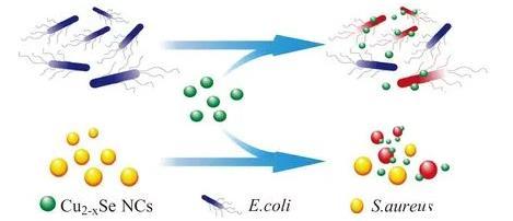 对病原微生物有杀死或抑制生长作用的抗菌剂是抗菌材料的核心部分,它可分为无机抗菌剂、有机抗菌剂和天然抗菌剂[4]。其中,无机抗菌剂一般利用银、铜、锌等金属自身的抗菌能力而制成抗菌剂[5],其耐热性较好且抗菌广谱;有机抗菌剂主要为香草醛或乙基香草醛类化合物[6],但耐热性较差,容易水解,且有效期短;天然抗菌剂主要来源于天然植物的提取,这也导致其数量较少且不能广谱抗菌。纳米技术的快速发展提供了用纳米材料控制病原微生物的可能和机会,由于其具有独特的化学和物理性质,现今已成为新型抗菌剂[7-8]。与银相比,铜的价格更低廉,且对各种细菌菌株具有优异的抗菌活性,因此铜基纳米材料越来越受欢迎。革兰氏阴性菌大肠杆菌和革兰氏阳性菌金黄色葡萄球菌对铜基纳米颗粒特别敏感,因此可用于治疗烧伤、手术伤口和糖尿病足溃疡感染[9]。作为抗菌剂,硫属铜化物拥有耐热性好、毒性低的优点,且可广谱持续抗菌[10]。基于硫属铜化物的这些特点,本实验利用硫属铜化物的重要代表之一的硒化铜纳米晶体(Cu2-xSe NCs)进行广谱抗菌。我们以常见的E.coli(革兰氏阴性菌)和S.aurues(革兰氏阳性菌)为模型菌株(图1),通过测定细菌存活率、细菌生长曲线和杀菌曲线,纳米材料的最小抑菌浓度(MIC)和最小杀菌浓度(MBC),以及杀菌动力学来评价Cu2-xSe NCs的抗菌性能。实验结果显示,Cu2-xSe NCs对大肠杆菌及其耐药菌株的MIC均为32μg/mL,而对金黄色葡萄球菌及其耐药菌株的MIC则为4μg/mL,这是由于大肠杆菌具有双层膜而金黄色葡萄球菌仅有单层膜。此外,仅需32μg/mL Cu2-xSe NCs就可在1 h内杀死所有大肠杆菌和金黄色葡萄球菌,证明了Cu2-xSe NCs拥有良好的抗菌性能。