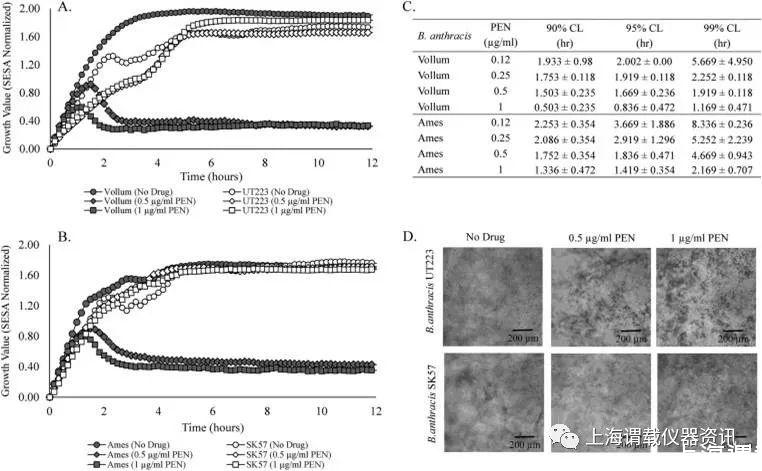 图4、在35℃条件下,通过光学筛选对炭疽杆菌Vollum(PEN)和UT223(PENr)(A)、Ames(PEN)和SK57(PENr)(B)的生长动力学进行评估。细菌的增长由SESA算法测量获得。表格C列出了在存在PEN的情况下确定炭疽杆菌Ames和Vollum的敏感性所需的时间(小时)。时间以平均值±重复生物学实验的标准偏差报告(D)在存在或不存在PEN的情况下,在35℃在8h后拍摄的抗性炭疽杆菌菌株的光学筛选图像。