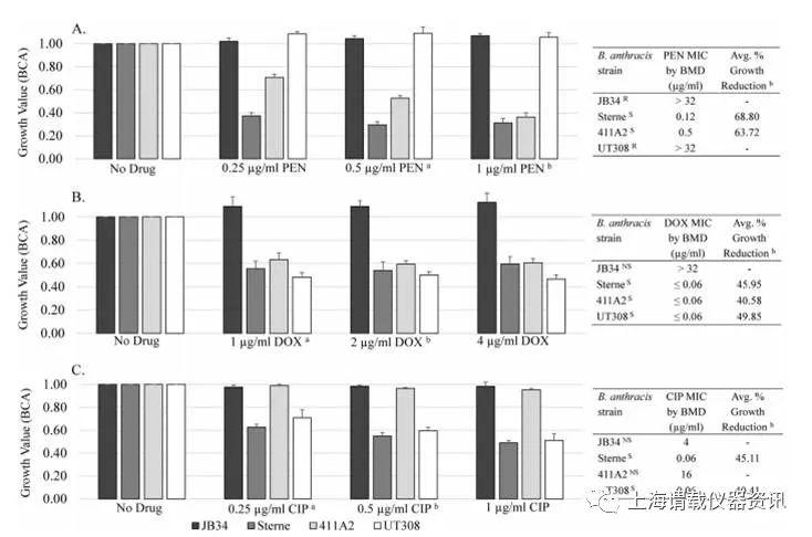 图1、减毒炭疽杆菌控制菌株的生长动力学。在存在或不存在PEN(A),CIP(B)或DOX(C)的条件下,在35°C下培养8小时后,Sterne(PEN s CIP s DOX s)和JB34(PEN r CIP ns DOX ns)。通过SESA算法测量炭疽杆菌的生长。
