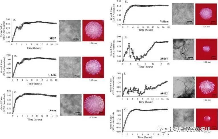 图3、在35°C下在18小时内评估了炭疽芽孢杆菌SK57(A),UT223(B),Ames(C),Vollum(D),A0264(E),A0102(F)和240(G)的生长动力学。在没有抗生素的情况下。通过SESA算法测量生长。除了炭疽芽孢杆菌A0264和A0102(其中的图由于其聚集表型而显示代表性的单个复制)之外,图表示平均生长值±来自三个复制孔的标准偏差。在6至8小时之间拍摄的细胞聚集的光学筛选图像和单个菌落的立体显微镜图像显示在右侧。