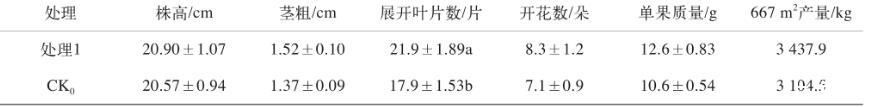 生长指标调查:分别在草莓苗期、初花期、幼果期、果实膨大期调查处理1和CK草莓的株高、茎粗、展开叶片数量、开花数量等指标。采用五点取样法,在各小区内分别取5点,每点3株,共计调查15株。在草莓收获期,5个小区内随机采收大小相近的草莓共15个,并称量单果质量。