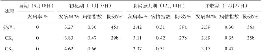由表2可知:调查中发现苗期无病害发生,在草莓开花初期、果实膨大期和采收期均有草莓白粉病发生,初花期,处理1病情指数为0.36,比CK降低了0.30,防效为45%,而CK的防效为29%;果实膨大期,处理1病情指数为0.31,比CK(0.51)降低了0.20,防效为39%,而CK的防效为27%;采收期,处理1病情指数为0.30,比CK(0.47)降低了0.17,防效为36%,而CK的防效为25%;综上,助友宝SOD微生物菌剂100倍液、有机水溶肥料海德丰1000(生物肥)1 000倍液均能降低草莓病情指数,但助友宝SOD微生物菌剂100倍液防治效果显著高于有机水溶肥料海德丰1000(生物肥)1 000倍液,说明类球红细菌对草莓白粉病有较好的防治效果。