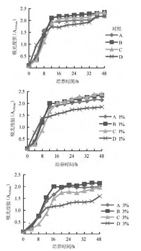 低糖酵母粉于空白YPD培养基中30℃过夜培养后,以菌液A600nm=0.1时的浓度接种于各低糖梯度的液体培养基中,置于30℃、200 r/min的摇床中进行观察培养,以不添加葡萄糖的培养基作为对照。每隔4 h测定其在波长600 nm条件下的吸光度值,直至48 h,观察酵母菌种在各盐含量下的生长情况。