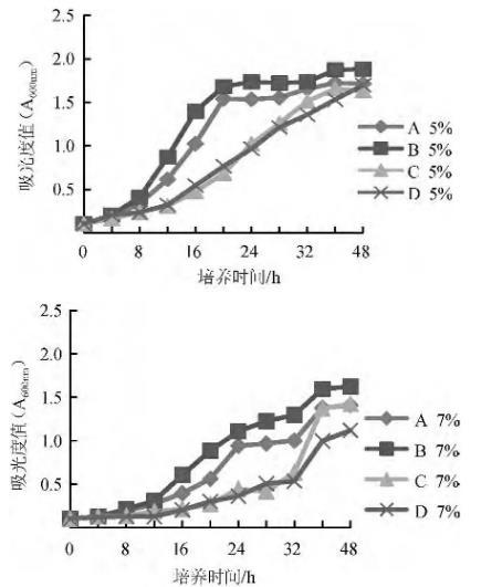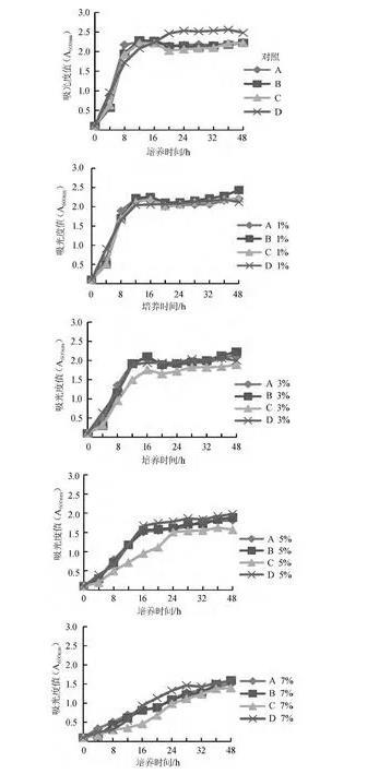 根据低糖酵母耐盐性生长曲线(见图1)分析可知,在不含盐和盐含量为1%时,4种低糖酵母的生长趋势差不多。而在盐含量为3%时,表现为D低糖酵母的生长趋势较缓慢。在含量为5%~7%时,A、B两种低糖酵母的生长趋势优于C和D两种低糖酵母。