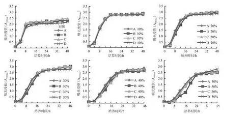 高糖酵母粉于空白YPD培养基中30℃过夜培养后,以菌液A600nm=0.1时的浓度接种于各高糖梯度的液体培养基中,置于30℃、200 r/min的摇床中进行观察培养,以不添加葡萄糖的培养基作为对照。每隔4 h测定其在波长600 nm处的吸光度值,直至48 h,观察酵母菌种在各盐含量下的生长情况。