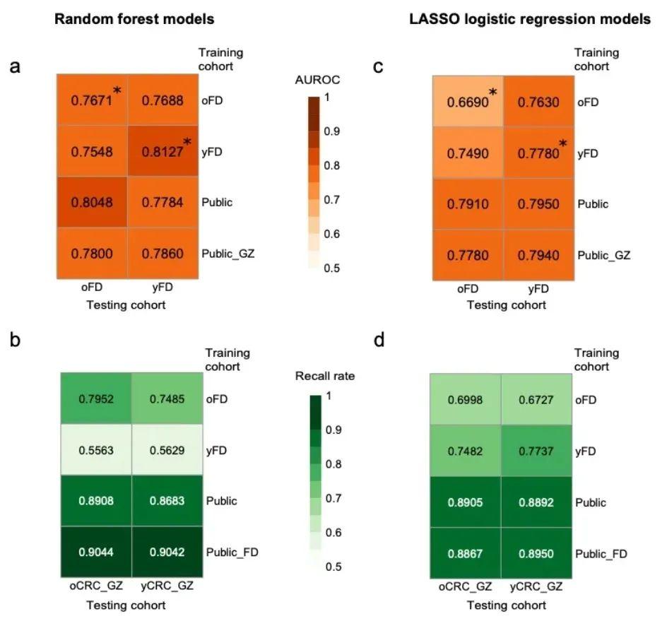 最后,研究者整合本中心以及其他公开的结直肠癌粪便宏基因组数据,总共1922份标本,使用机器学习方法分别构建针对年轻和年老肠癌的分类器,并验证分类效果?;诓煌盗费炯姆掷嗥鳎阅昵岢Π┖屠夏瓿Π┒季哂杏判愕脑げ庑Ч?。这一发现进一步突显了粪便微生物在结直肠癌(尤其是年轻肠癌)筛查中的巨大潜力。