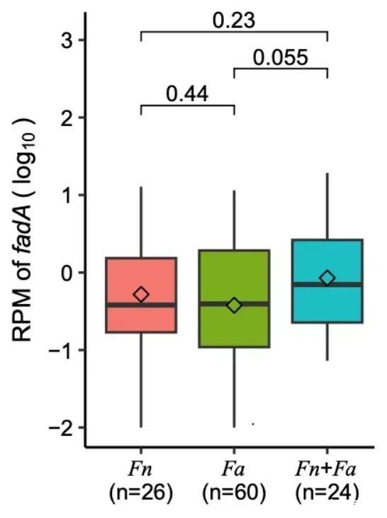 具核梭杆菌(Fusobacterium nucleatum,Fn)是结直肠癌与肠道微生物研究中热度最高的一个细菌。研究者利用高深度宏基因组数据,在菌株层面对Fn及其近源物种动物梭杆菌(Fusobacterium animalis,Fa)进行了深度解析,发现在结直肠癌患者的粪便中Fa的出现率和相对丰度都高于Fn。既往研究表明,Fn可以通过粘附蛋白附着到宿主细胞,引起DNA损伤。fadA基因是粘附蛋白的一个编码基因,被称为毒力因子。在仅含有Fn或Fa的CRC患者中,研究者发现fadA基因的含量没有差异,表明Fn和Fa菌株很可能都携带有fadA毒力因子。