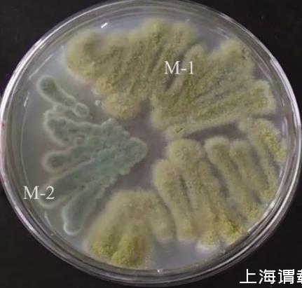 分离纯化获得两种霉菌,分别命名为M-1和M-2,菌落形态如下图。经初步鉴定M-1为米曲霉、M-2为绿色木霉。