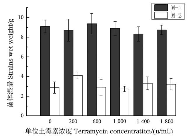 配制含有土霉素0、200、600、1 000、1 400和1 800 u/mL,pH 3的察氏液体培养基各100 mL,分别加入250 mL锥形瓶中。吸取1 mL的M-1、M-2的孢子悬液接入不同土霉素含量的察氏液体培养基中,在30℃,160 r/min条件下培养6 d。用5 000 r/min离心10 min,获得湿菌丝,称重,分析并比较土霉素对菌体生长的影响,考察其土霉素耐受性。