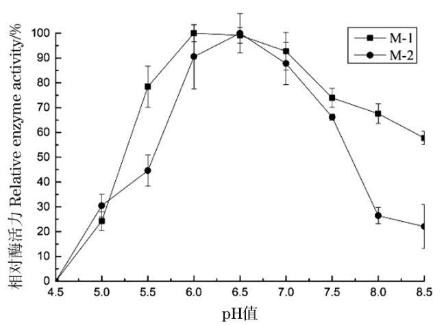 向100 mL/250 mL察氏培养基中,分别接入1 mL M-1、M-2孢子悬液,初始pH值分别设定为5.5、6、6.5、7、7.5、8、8.5,平行3组,在30℃,转速为160 r/min条件下培养168 h,分别取样测定酶活,考察pH值变化对产酶活性的影响,结果如图5。