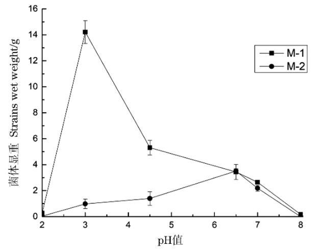 分别配制pH值为2、3、4.5、6.5、7、8的100 mL/250 mL察氏培养基。分别接入1 mL的M-1、M-2的孢子悬液,每个梯度平行做3组,在30℃,160 r/min条件下培养6 d。5 000 r/min离心10 min,称量菌丝湿重,考察菌株的土霉素耐受性。