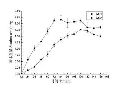 在装有100 mL察氏培养基的250 mL锥形瓶中,分别接入1 mL的M-1、M-2孢子悬液。每种菌做3组平行,每组13瓶。30℃、160 r/min摇床上培养。每隔12 h取出6瓶,5 000 r/min离心10 min,称量菌丝湿重,绘制生长曲线。