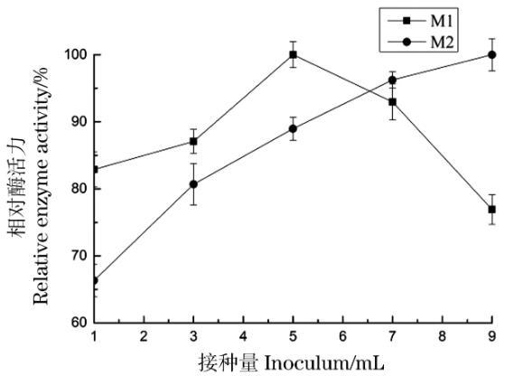 在100 mL/250 mL 5%的菌渣培养基中,分别接种1、3、5、7和9 mL的M-1、M-2孢子悬液,平行3组。在pH 6.5,转速为160 r/min,30℃条件下培养144 h,分别取样测定酶活,考察接种量对产酶活性的影响,结果如图9。