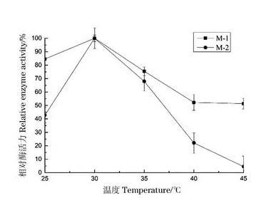 向100 mL/250 mL察氏培养基中,分别接入1 mL M-1、M-2孢子悬液,pH值为6.5,培养温度分别设置为25℃、30℃、35℃、40℃、45℃,平行3组。在转速为160 r/min条件下培养168 h,分别取样,测定酶活,考察温度的变化对产酶活性的影响,结果如图6。