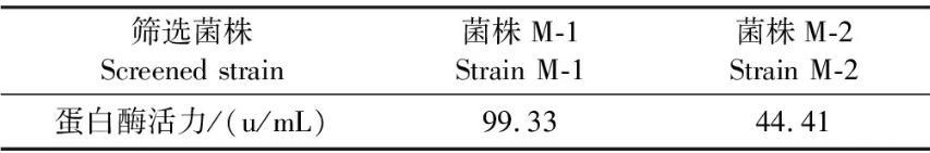 M-1的优化培养条件:在250 mL锥形瓶中,40 mL装液量,10%菌渣添加量,5%接种量,pH值6.0,30℃,摇床转速160 r/min培养168 h;M-2的优化培养条件:在250 mL锥形瓶中,100 mL装液量,5%菌渣添加量,9%接种量,pH值6.5,30℃,摇床转速160 r/min培养144 h。发酵结束后,测定蛋白酶活力。结果见表1。