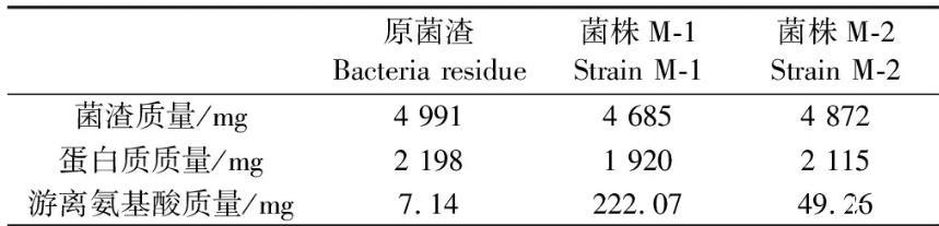 筛选菌株对菌渣成分的转化研究中,共考察了菌渣总重量、蛋白成分的变化和发酵后游离氨基酸的变化等内容,结果见表2。