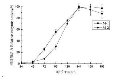 分别向100 mL/250 mL察氏培养基中接入1 mL M-1孢子悬液、1 mL M-2孢子悬液,pH值为6.5,平行3组。在30℃转速为160 r/min条件下培养192 h。每隔24 h分别取样测定酶活,考察培养时间对产酶活性的影响,结果如图7。
