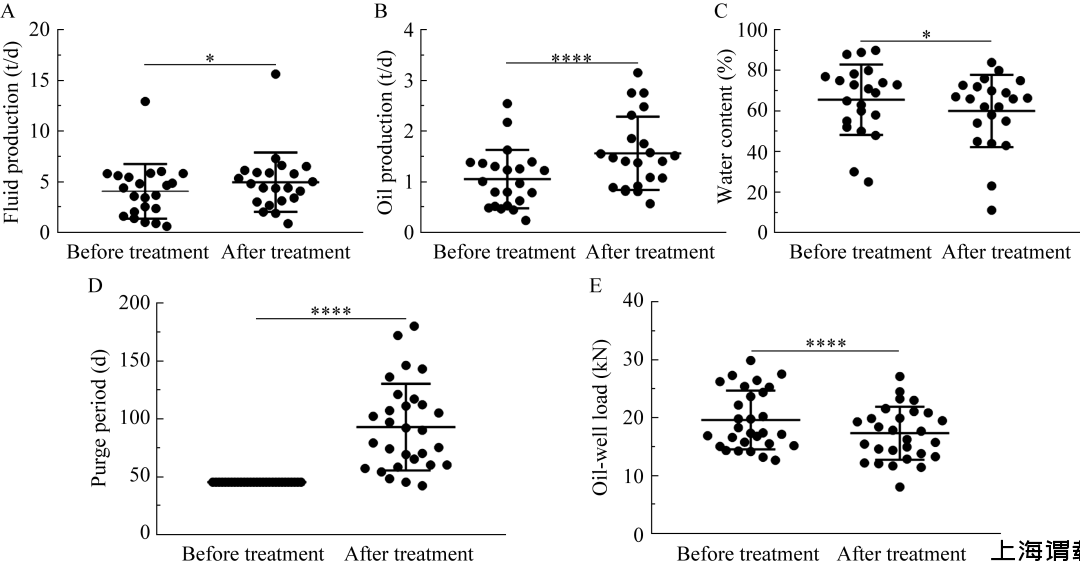 图5微生物单井吞吐和油井清防蜡效果评价产液量(A)、产油量(B)和含水率(C)用于评估微生物单井吞吐效果,洗井周期(D)和油井载荷(E)用于评估清防蜡效果