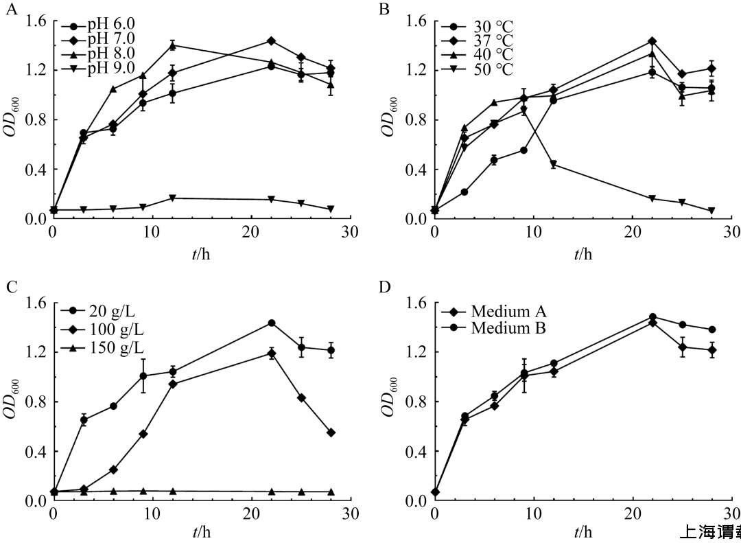 图2菌株B6在不同环境下的生长曲线分析A:pH.B:温度.C:矿化度.D:培养基对菌株B6生长的影响