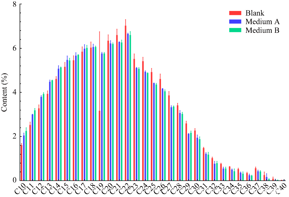 对菌株B6处理前后原油中的饱和烃(C10?C40)进行检测,分析处理前后不同饱和烃组分的含量变化,以探讨对原油物性的影响。与空白组相比,使用改良LB培养基培养时,C10?C20的含量增加了5.60%,C21?C30和C31?C40的含量分别减少了4.18%和1.42%;使用发酵培养基培养时,C10?C20的含量增加了6.28%,C21?C30和C31?C40的含量分别减少了4.60%和1.68%。随着碳数的增加,菌株B6处理后原油中的饱和烃降解率呈现下降趋势,特别是C30?C40范围内的烃类物质(图4)。结果表明,菌株B6能够对长链饱和烃进行分解,因此原油中大分子组分的减少和短链烃的增加有效地降低了原油的黏度,改变了原油物性。此外,当碳数高于20时,易出现结蜡现象,经处理后碳数高于20的长链饱和烃明显减少,这有助于减缓油井结蜡现象,延长洗井周期。综上所述,B.velezensis B6能够降解原油中的大分子重质组分和长链烃等物质,表明该菌在油田微生物驱油和油井清防蜡中具有良好的应用前景。