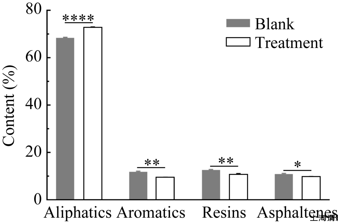 原油通常是一种化学成分复杂的黑色易燃液体,根据其在有机溶剂中的溶解度不同,可分为饱和烃、芳香烃、树脂和沥青质。使用发酵培养基对菌株B6处理前后的原油进行四组分测试,各组分含量如图3所示。经菌株B6处理后,原油中的饱和烃含量显著增加了4.38%(P<0.000 1),芳香烃、树脂和沥青质含量减少,其中沥青质在处理前后含量差异不大(图3)。这可能是该菌较强的乳化性能提高了细菌对疏水性烃类的可利用性,从而提高了长链或大分子多环烃的降解。此外,沥青质等大分子是原油高黏性和油井堵塞的主要原因,该菌在一定程度上能够降解该类大分子物质。因此,表明菌株B6能够将原油中的大分子重质物质,如树脂和沥青质,降解成小分子轻质石油基组分,增加了原油流动性,提高了原油的品质。